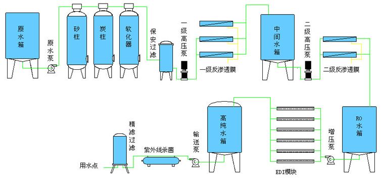 反滲透裝置主要是通過膜兩側(cè)的壓差為動(dòng)力,只允許水通過而截留除了氫離子和氧離子的其他離子,對(duì)各種離子除去率也不一樣,這個(gè)也是由于其結(jié)構(gòu)和原理所決定的,據(jù)統(tǒng)計(jì)反滲透對(duì)3+離子的去除率大概在95%-99%,對(duì)2+離子的去除率在92%-99%%,對(duì)1+離子去除率在70%-95%左右。對(duì)2-陰離子去除率80%-90%,1-陰離子去除率在75%-95%左右,除硝酸根離子去除率50%-75%。。 二、反滲透進(jìn)水水質(zhì)要求 污染指數(shù):<4 含氧量:<1.5mg/L CL離子:<0.5mg/L Fe離子:<0.05mol/L 三、污染物去除率: 脫鹽率:》97% 有機(jī)物去除率:》95% 細(xì)菌去除率:》99% 四、反滲透純水設(shè)備一般工藝流程圖: ![]() 原水箱→原水泵→→石英砂過濾器→活性炭吸附器→精密過濾器→一級(jí)高壓泵→一級(jí)反滲透裝置→中間水箱→二級(jí)高壓泵→二級(jí)反滲透→殺菌器→凈水箱→用水點(diǎn)