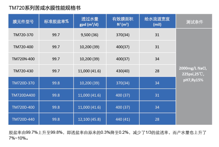 TM720D-370是采用較新的材料及生產(chǎn)技術(shù)的一款高脫鹽率、高產(chǎn)水量、耐化學(xué)清洗的膜元件。有效膜面積為370平方英尺,給水流道34mil。適合于含鹽量10000ppm以下的苦咸水淡化,以及微污染地表水的脫鹽、冷卻循環(huán)排污水的回用等各種應(yīng)用領(lǐng)域。TM720D-370具有較寬泛的清洗pH值范圍(pH1~13),可以快速有效的解決膜元件的污染問(wèn)題;反滲透膜片能夠承受一定范圍內(nèi),由于操作失誤等原因造成的輕微余氯泄露事故,提高了系統(tǒng)的安全性。
