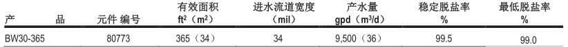 陶氏 FILMTEC™ BW30-365膜元件公稱有效膜面積 365平方英尺,標(biāo)準(zhǔn)測試條件下產(chǎn)水量為36m 3 /d(9500gpd),其外徑與其它標(biāo)準(zhǔn) 8英寸元件相同。BW30-365不是通過提高膜通量及增加操作壓力而是通過增加膜面積來提 高產(chǎn)水量,因此能保持很低的污堵速率,從而維持長期高產(chǎn)水量,延長膜元件的壽命。同時(shí)其運(yùn)行壓力低,提高了系統(tǒng)運(yùn)行的經(jīng)濟(jì)性。BW30-365的高有效面積可使新設(shè)計(jì)的 RO系統(tǒng)使用更少的元件,從而使系統(tǒng)緊湊,節(jié)省安裝費(fèi)用。在改造舊系統(tǒng)時(shí),BW30-365可降低系統(tǒng)的運(yùn)行壓力,降低元件的污堵,延長元件的壽命。用該元件更換時(shí),可增加原系統(tǒng)的產(chǎn)水量而無需擴(kuò)建;或者可維持原產(chǎn)水量而縮小裝置的外形尺寸。
