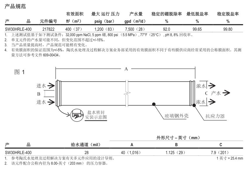 ● 在產(chǎn)水分段式海水淡化系統(tǒng)中選用該元件,不會(huì)削弱下游段的性能。