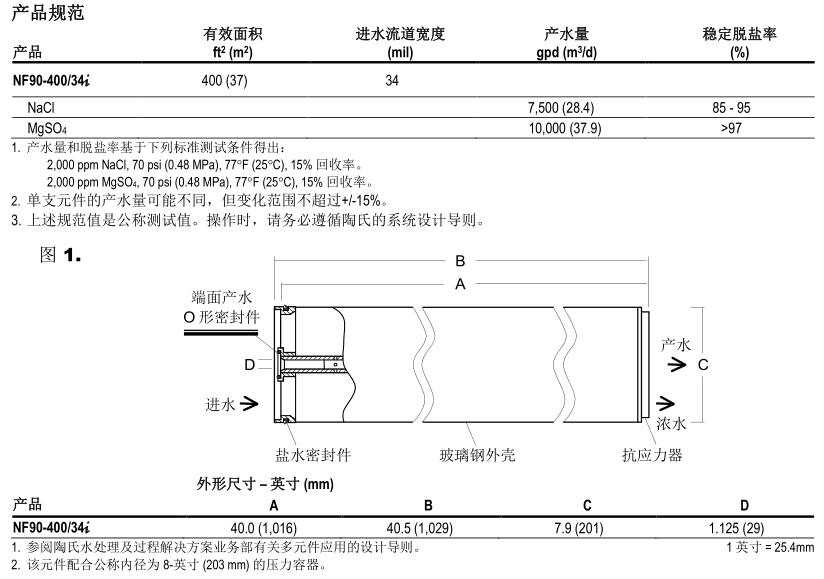 陶氏 FILMTEC™ NF90-400/34i 是一款高膜面積、高產(chǎn)水量的納濾膜元件