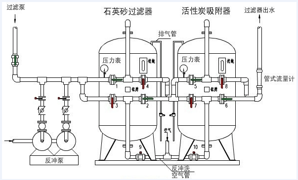 | 一、雙濾料(介質(zhì))過(guò)濾器介紹 雙濾料過(guò)濾器又稱為雙介質(zhì)過(guò)濾器,多介質(zhì)過(guò)濾器,雙濾料過(guò)濾器顧名思義就是填充的濾料有兩種填料的過(guò)濾器叫雙濾料過(guò)濾器,在凈化水系統(tǒng)中常見(jiàn)的濾料有:無(wú)煙煤,陶粒、石英砂、活性炭等。下面來(lái)介紹雙濾料(介質(zhì))過(guò)濾器相關(guān)知識(shí)。 二、雙濾料(介質(zhì))過(guò)濾器結(jié)構(gòu)組成 多介質(zhì)過(guò)濾器一般有碳鋼或不銹鋼304制作,內(nèi)涂環(huán)氧樹脂或內(nèi)襯天然橡膠防腐,布水系統(tǒng)有吊籃布水,下有穹形板布水,不銹鋼管式布水,平板布水,布水水帽有ABS蘑菇型和繞絲柱形布水,其中管式布水和,穹形板布水下有墊層,有大的鵝卵石或大的石英砂組成,這主要是他們空隙大,阻力下,便于收集水和反洗。 雙(介質(zhì))濾料過(guò)濾器的濾層設(shè)計(jì)濾料一般要考慮粒徑要求下層濾料粒徑小于上層濾料粒徑,以保證下層濾料的有效性和充分利用。上層的密度要小,以保證反洗之后分層復(fù)原,如果上層密度小,那么經(jīng)過(guò)反洗之后上層的濾料沉到下層了。 以兩層濾床為例,上層濾料顆粒最大,密度小的輕質(zhì)濾料組成,如無(wú)煙煤、活性炭;下層濾料粒徑小,密度大,一般為石英砂組成;形成了上層濾料起粗濾作用,阻力下,水頭損失小,下層濾料起精濾作用,截污能力強(qiáng),這樣就充分發(fā)揮了多介質(zhì)濾床的作用,即水頭損失小,過(guò)濾效果好的特點(diǎn),充分發(fā)揮了各介質(zhì)的優(yōu)點(diǎn)。 三、雙濾料(介質(zhì))過(guò)濾器常見(jiàn)濾料介紹 1、石英砂濾料 石英砂一般做為純水設(shè)備以及超濾設(shè)備的預(yù)處理,他主要是通過(guò)過(guò)濾層泥沙,膠體,金屬離子以及有機(jī)物進(jìn)行截留,吸附。在一般的水處理常用,因?yàn)槠錈o(wú)污染,價(jià)格低廉,運(yùn)行成本低,所以應(yīng)用比較廣泛。 2、活性炭濾料 活性炭是一種很細(xì)小的炭粒單位面積有很大的微孔,通常我們叫他毛細(xì)管孔。這種毛細(xì)管具有很強(qiáng)的吸附能力,由于炭粒的表面積很大,在與與水中雜質(zhì)充分接觸。這些雜質(zhì)能被吸附在微孔中,從而去掉水中膠體等雜質(zhì)?;钚蕴窟€能吸附水中的CL離子以及臭氧,對(duì)水中的有機(jī)物也有一定的吸附能力,能明顯的對(duì)水中的色素進(jìn)行吸附,在水處理行業(yè)一般我們要求碘值在700mg以上,這樣的活性炭的吸附能力較強(qiáng)。 3、無(wú)煙煤 無(wú)煙煤是從深井礦物中精選的,具有最高的含碳量百分比,做水處理用的無(wú)煙煤濾料采用人工分類還經(jīng)過(guò)過(guò)濾和沖洗,減少無(wú)關(guān)礦物質(zhì)并降低灰分含量確保其適合水過(guò)濾之用,外觀光澤度好,呈多棱形顆粒狀,抗壓耐磨性強(qiáng)。由于無(wú)煙煤濾料具有較好的固體顆粒保持能力,因此無(wú)煙煤濾料能夠可靠地提高懸浮顆粒清除能力,此外它的均勻系數(shù)較低有助于加快流速。 4、錳砂濾料 錳砂濾料主要依靠它自身錳砂的催化作用外,還有在過(guò)濾時(shí)在錳砂濾料表面逐漸形成一層鐵質(zhì)濾膜作為活性濾膜,能起催化作用。新生成的氧化鐵作為活性濾膜物質(zhì)又參與新催化除鐵過(guò)程,所以活性濾膜除鐵過(guò)程是一個(gè)自動(dòng)催化過(guò)程。主要用于地下水處理,循環(huán)水處理級(jí)污水處理等。 總體來(lái)說(shuō),在這幾種濾料中,石英砂有其密度大,顆粒小,價(jià)格便宜優(yōu)點(diǎn)。無(wú)煙煤有其密度小,截污能力強(qiáng),顆粒較大價(jià)格比較實(shí)惠等特點(diǎn),它介于石英砂和活性炭濾料的一種過(guò)濾介質(zhì)?;钚蕴坑衅涿芏刃?,除味脫色能力強(qiáng),但價(jià)格比較貴,一般在應(yīng)用在飲用水中,除了有以上功效外,還能改善水的口感。錳砂濾料主要是除去水中的鐵錳,常用于地下水井水處理系統(tǒng)以及循環(huán)水處理系統(tǒng)。 五、雙介質(zhì)濾料過(guò)濾器選型參數(shù) ![]() |
